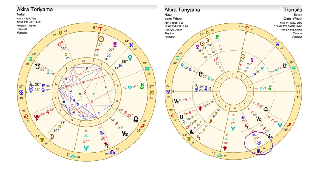 In 1980, Akira gave birth to the very successful and famous Dr Slump manga series (which has sold 35 million copies by 2008) which made Akira a household name. Looking at the transits in the sky for Akira at that time, his lovely Jupiter Uranus Mercury and Saturn grand trine was being set off by transiting Uranus at 23 degrees Scorpio. His success with Dr Slump was later followed by yet another blockbuster success, the Dragon Ball series in 1984. See his astrological natal chart and transit chart for 1980. Birthtime of his chart is unknown therefore the exact placements of his planets in terms of houses are not known but the planetary aspects, signs and degrees can still be read except for the moon as the moon moves relatively quickly.